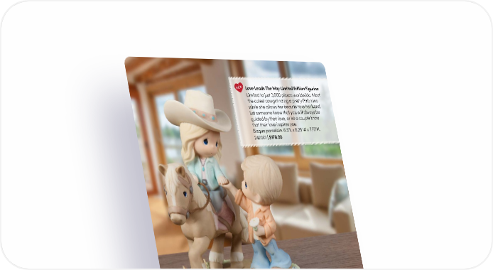 9 NEW Love Leads The Way Limited Edition Figurine Limited to just 3,000 pieces worldwide. Meet the cutest cowgirl riding a pretty Palomino while she allows her beau to take her hand. Let someone know that you will always be guided by their love, or let a couple know that their love inspires you. Bisque porcelain. 6.5"L x 6.25"W x 7.75"H. 242001 | $170.00 Your Love Lifts Me Higher Limited Edition Figurine Limited to only 3,000 pieces worldwide. These two lovebirds share a glorious spring day outdoors. He pushes her gently on a swing while she listens to his hopes and dreams for their future. Bisque porcelain. 7.5"L x 6"W x 7.75"H. 213004 | $175.00
