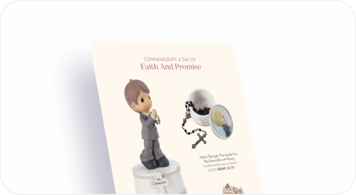PreciousMoments.com | 866-336-2554 16 COMMEMORATE A DAY OF Faith And Promise Faith Is The Light That Guides You Girl Rosary Box with Rosary Thoughtful and useful, this artfully designed rosary box features a young lady praying on the lid and an uplifting message inside. A traditional white, pearl-look rosary is included. 202428 | $32.25 $22.50 Faith Is The Light That Guides You Boy Rosary Box with Rosary A traditional black rosary is included. 202423 | $30.00 $22.50 Holy Communion Boy Musical On his First Communion, give a precious gift that will be treasured for a lifetime. It is the perfect faith-filled accent for his bedroom. Plays “The Lord’s Prayer”. 212103 | $48.25 Holy Communion Girl Musical Hands in prayer, dress of all white, it must be her First Holy Communion! Plays “The Lord’s Prayer”. 212102 | $48.25