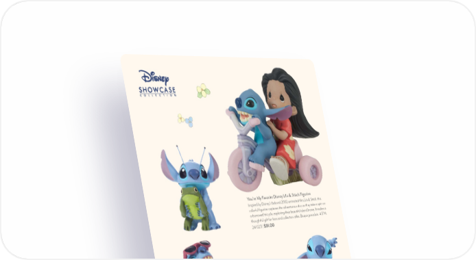 PreciousMoments.com | 866-336-2554 40 Disney Stitch Mini Figurines Fans of Disney’s 2002 animated film Lilo & Stitch will love these extra-terrestrial mini figurines. Give as a thoughtful birthday gift, holiday gift, or “just because” present to anyone who is a fan of Stitch. Resin. Hug It Out | 242701 | 3"H | $20.00 Time To Chill | 242702 | 2.75"H | $20.00 My ‘Ohana Song | 242705 | 2.5"H | $20.00 Let’s Dance | 242704 | 2.5"H | $20.00 Over The Moon | 242706 | 2.25"H | $20.00 I’m Lost | 242703 | 2.5"H | $20.00 You’re My Favorite Disney Lilo & Stitch Figurine Inspired by Disney’s beloved 2002 animated film Lilo & Stitch , this colorful figurine captures the adventurous duo as they take a spin on a borrowed tricycle, exploring their beautiful island home. It makes a thoughtful gift for fans and collectors alike. Bisque porcelain. 4.5"H. 241023 | $91.00 © Disney