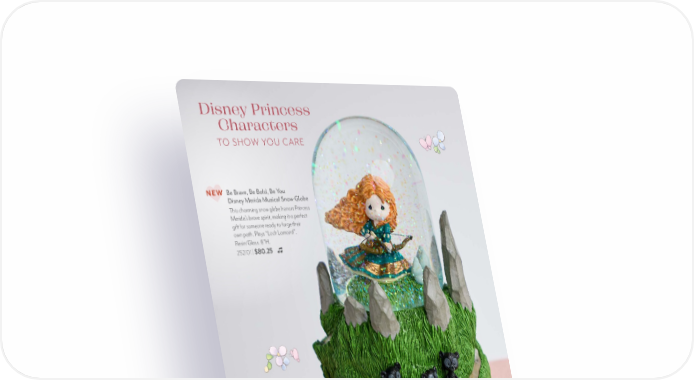 PreciousMoments.com | 866-336-2554 16 © Disney/Pixar. Disney Princess Characters TO SHOW YOU CARE Be Brave, Be Bold, Be You Disney Merida Musical Snow Globe This charming snow globe honors Princess Merida’s brave spirit, making it a perfect gift for someone ready to forge their own path. Plays “Loch Lomond”. Resin/Glass. 6"H. 252101 | $80.25 NEW Disney Ariel Lighted Cutout Dress Musical Plays “Part Of Your World”. Includes 3 button cell batteries. Resin. 5.5"H. 192111 | $60.00 $15.00 with purchase of $40.00 or more. ($60.00 Retail Value). Valid through 8/1/26 or while supplies last. YOURS FOR ONLY $ 15 .00 Special Offer