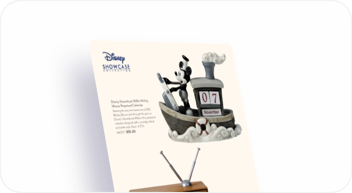 PreciousMoments.com | 866-336-2554 8 Disney Steamboat Willie Mickey Mouse Perpetual Calendar Steering his way into hearts since 1928, Mickey Mouse sails through the year on Disney’s Steamboat Willie in this perpetual calendar designed with a nostalgic black and white style. Resin. 4.5"H. 144707 | $55.00 Mickey’s Fire Brigade Disney Mickey Mouse Figurine This classic Mickey Mouse figurine will have you recalling all of your favorite animated films of yesteryear. Resin. 5"H. 232702 | $35.00 Disney Steamboat Willie Musical Shadow Box This musical shadow box features Mickey Mouse as he appeared in his historic 1928 debut. Plays “Steamboat Willie” whistle tune. Requires 3AAA batteries, included. Resin. 5.75"H. 251702 | $65.00 NEW