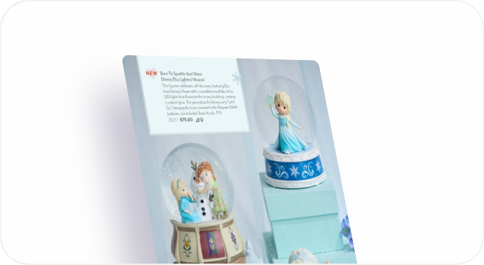 13 © Disney Let Your Love Shine Through Disney Elsa Figurine An empowering reminder that every girl has the power to shine, this enchanting figurine is inspired by Disney’s Frozen . Bring the story to life in a way that fans can see themselves with a real ice castle-shaped mirror. Bisque porcelain/Acrylic. 6.25"H. 252015 | $96.50 NEW Do You Want To Build A Snowman Disney Frozen Musical Snow Globe Immerse yourself in the moment Elsa brings Olaf to life! The snow globe is fashioned with Nordic details that make you feel you have stepped into the castle at Arendelle. Plays “Do You Want To Build A Snowman?” Requires 3AAA batteries, included. Resin/Glass. 5.5"H. 242710 | $70.00 Born To Sparkle And Shine Disney Elsa Lighted Musical This figurine celebrates self-discovery, featuring Elsa from Disney’s Frozen with a crystalline snowflake. It has LED lights that illuminate the snowy backdrop, creating a radiant glow. The piece plays the Disney song “Let It Go,” bringing the iconic moment to life. Requires 3AAA batteries, not included. Resin/Acrylic. 5"H. 252711 | $75.00 NEW