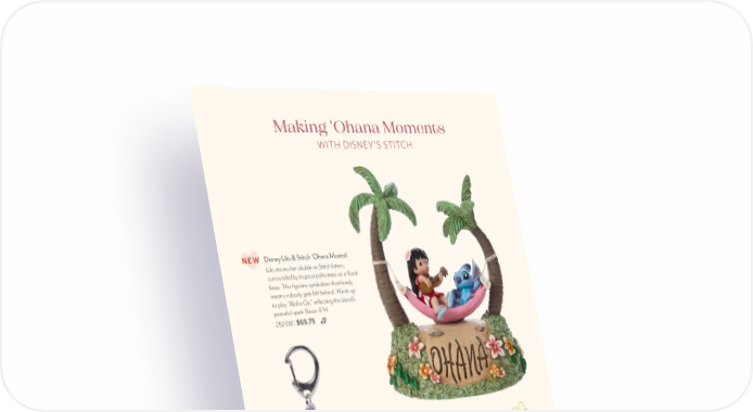 PreciousMoments.com | 866-336-2554 38 Making ’Ohana Moments WITH DISNEY’S STITCH Disney Stitch Sitting Backpack Clip PVC. 2.5"H. 242712 | $6.00 Disney Lilo & Stitch ’Ohana Musical Lilo strums her ukulele as Stitch listens, surrounded by tropical palm trees on a floral base. This figurine symbolizes that family means nobody gets left behind. Winds up to play “Aloha Oe,” reflecting the island’s peaceful spirit. Resin. 6"H. 252108 | $69.75 NEW We Were Made For Each Other Disney Stitch & Angel Figurine This figurine was created to celebrate a bond that is truly out of this world, featuring the lovable experiments Stitch and Angel. Give it to your special someone or any fan of Disney’s Lilo And Stitch . Resin. 5"H. 252704 | $55.00 NEW